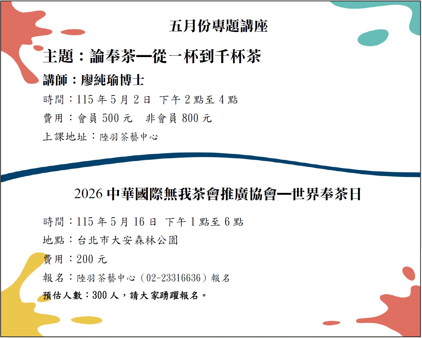 2026年五月份講座及世界奉茶日活動